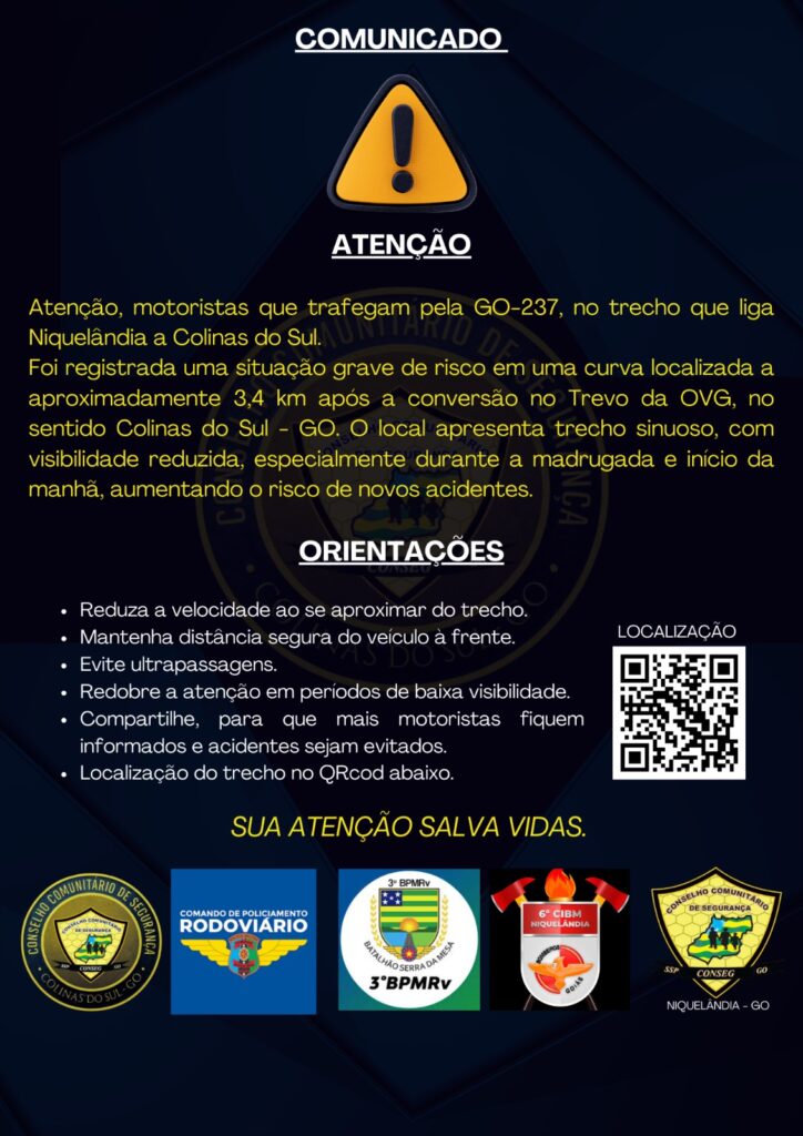 “Peço a todos que tenham cautela nesse deslocamento na GO-132. É uma rodovia recentemente pavimentada, a pista está muito boa, mas temos que redobrar a atenção e obedecer a sinalização.”