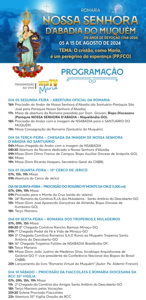 Começou neste dia 05 de agosto a Romaria de Nossa Senhora da Abadia de Muquém no município de Niquelândia–GO, uma das mais tradicionais do Brasil, com 276 anos de muita fé e devoção. A festa de Muquém iniciou-se com a saída da imagem do Santuário de São José, no centro antigo de Niquelândia, onde foi celebrada uma missa. Em seguida, em um andor, a procissão com a imagem pequena até a Paróquia Nossa Senhora da Abadia, no bairro Belo Horizonte.