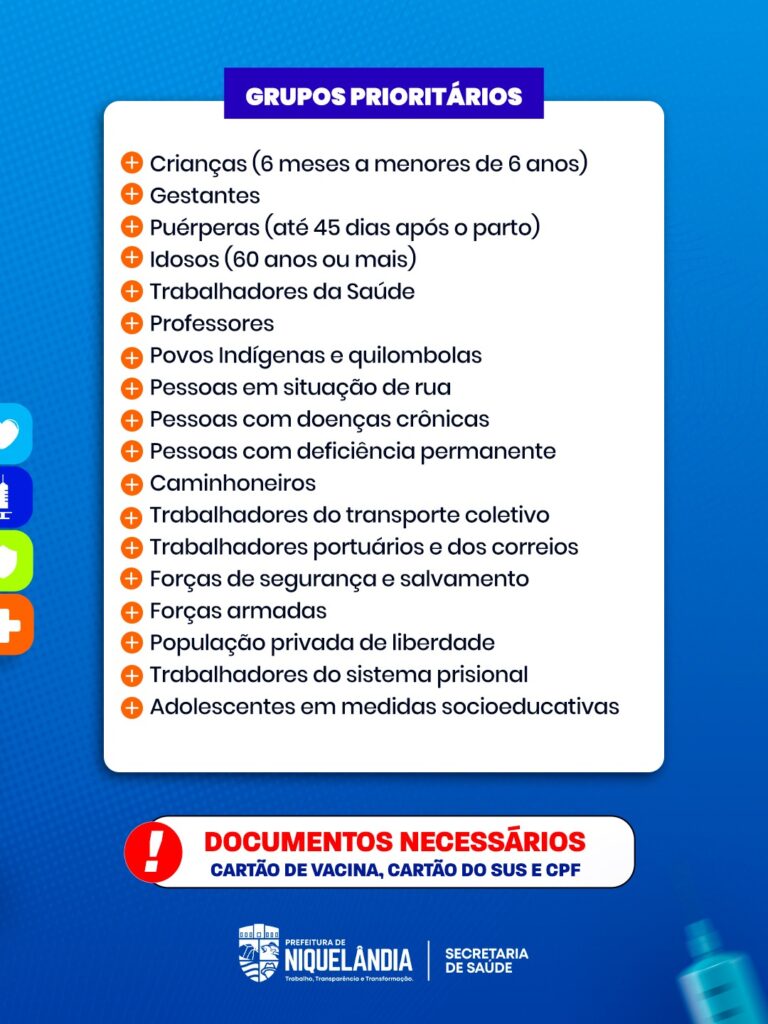Em alinhamento com a Campanha Nacional de Vacinação contra a Influenza 2026, Niquelândia mobiliza todas as unidades básicas de saúde da zona urbana para o Dia D, que será realizado neste sábado (28/03), das 8h às 16h, com atendimento exclusivo aos grupos prioritários definidos pelo Ministério da Saúde.