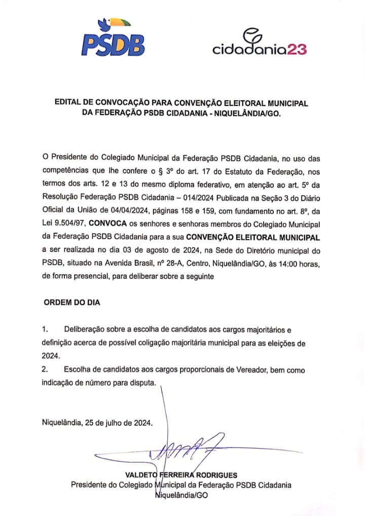 EDITAL | FEDERAÇÃO PSDB CIDADANIA | COLEGIADO MUNICIPAL DE NIQUELÂNDIA | O PRESIDENTE DO COLEGIADO MUNICIPAL PSDB CIDADANIA CONVOCA OS SENHORES E AS SENHORAS MEMBROS DO COLEGIADO, PARA A CONVENÇÃO ELEITORAL MUNICIPAL