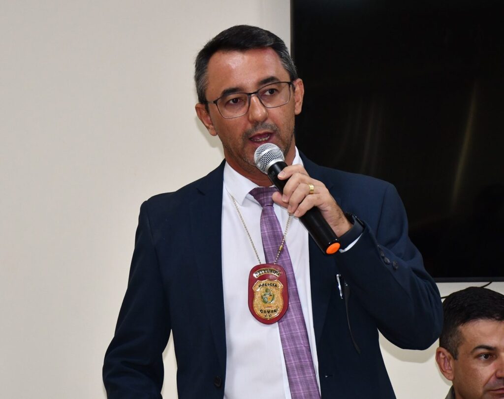 Cássio Arantes do Nascimento, delegado da Polícia Civil em Niquelândia, durante pronunciamento na posse do Conseg. Foto: Patricia Bastos