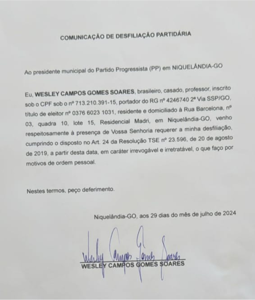 Na manhã desta segunda-feira dia 29, o Secretário Municipal de Educação de Niquelândia, professor Wesley Campos Gomes Soares, assinou seu pedido de desfiliação do Partido Progressista. Wesley havia ingressado no partido no dia 18 de março, a convite do deputado federal Adriano do Baldy, que abonou sua ficha em uma reunião no escritório político do deputado em Goiânia.
